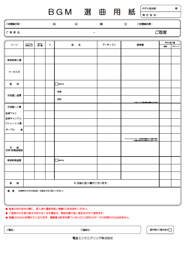 ご披露宴で使用するBGMを「BGM選曲用紙」にご記入ください。